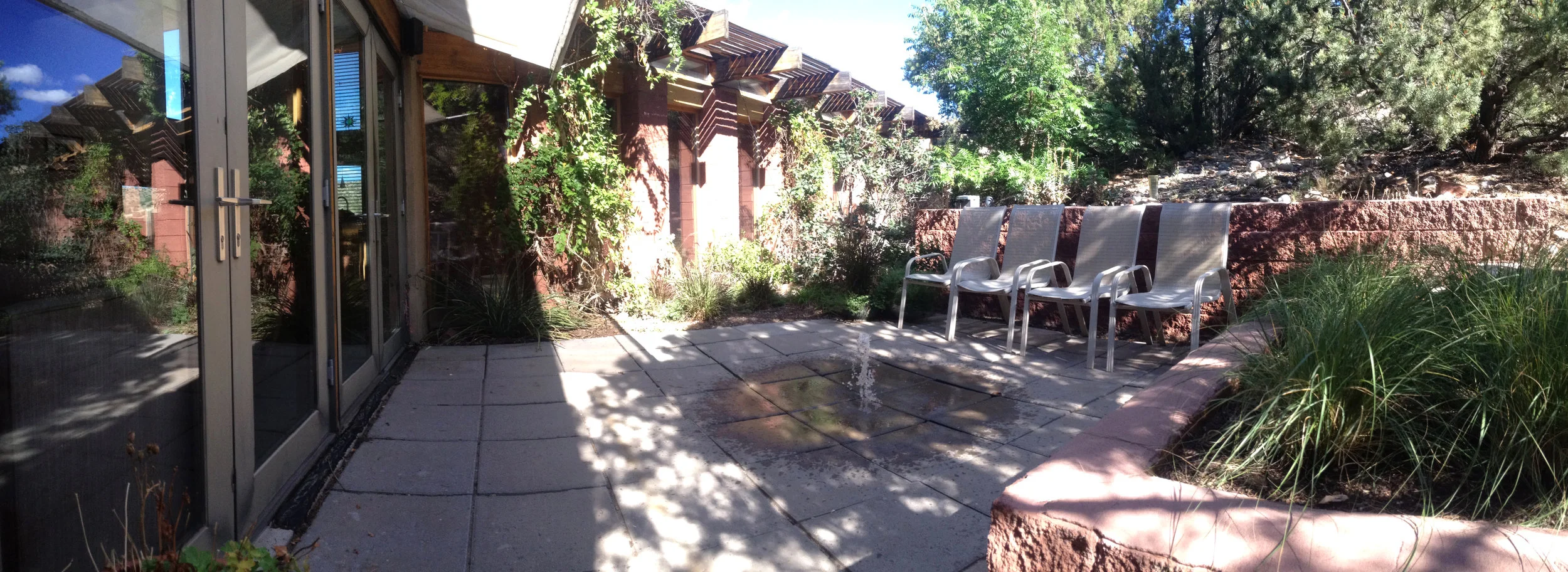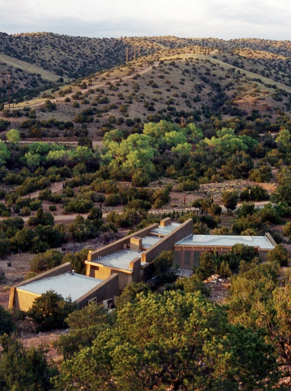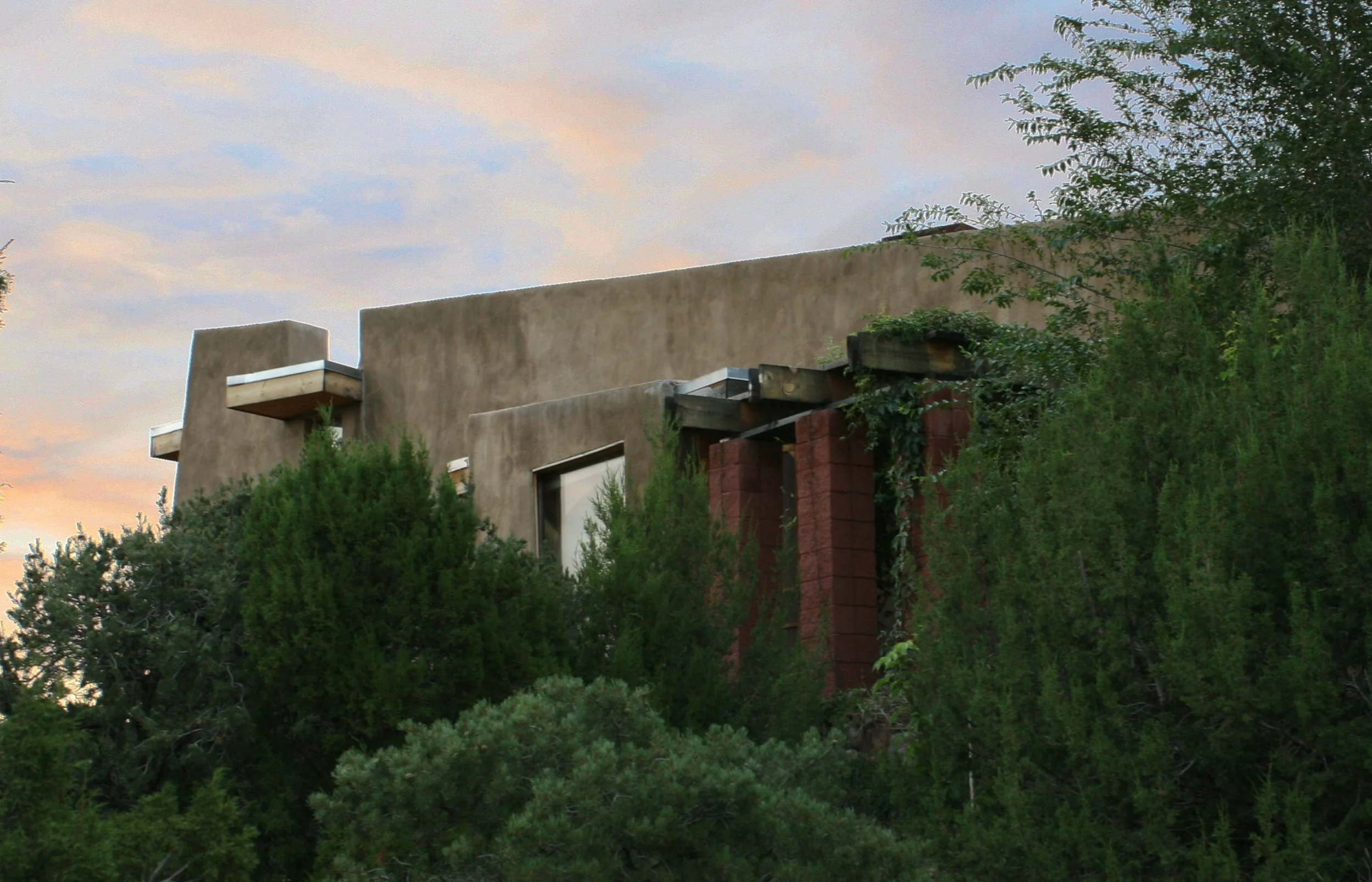 Aligned with the solstice sunrise and sunset azimuth angles the Solstice House is designed to respond to its high desert climate, shading its occupants in the summer and welcoming in the warming winter sun. This passive solar residence is built with 'Rastra' insulated concrete walls and structurally insulated roof panels making it very energy efficient . Taking advantage of its high desert climate the home is organized around a central courtyard with roof top terraces to take advantage of views down Las Huertas Creek. A double set of french doors opens the living room to the courtyard expanding the living space outdoors. Sheltered by the two wings of the house the courtyard is protected by winter winds and provides shading in the summer. Oriented to the southern sun the courtyard is warm and comfortable in the winter and cool and pleasent in the summer complete with its solar fountain. The courtyard pavers slope to a central cistern that is filled by rainwater. The self regulating fountain is tied to a remote solar panel and can be truned on or off as desired. The single fountain nozzle is flush with pavers and invisble when turned off.